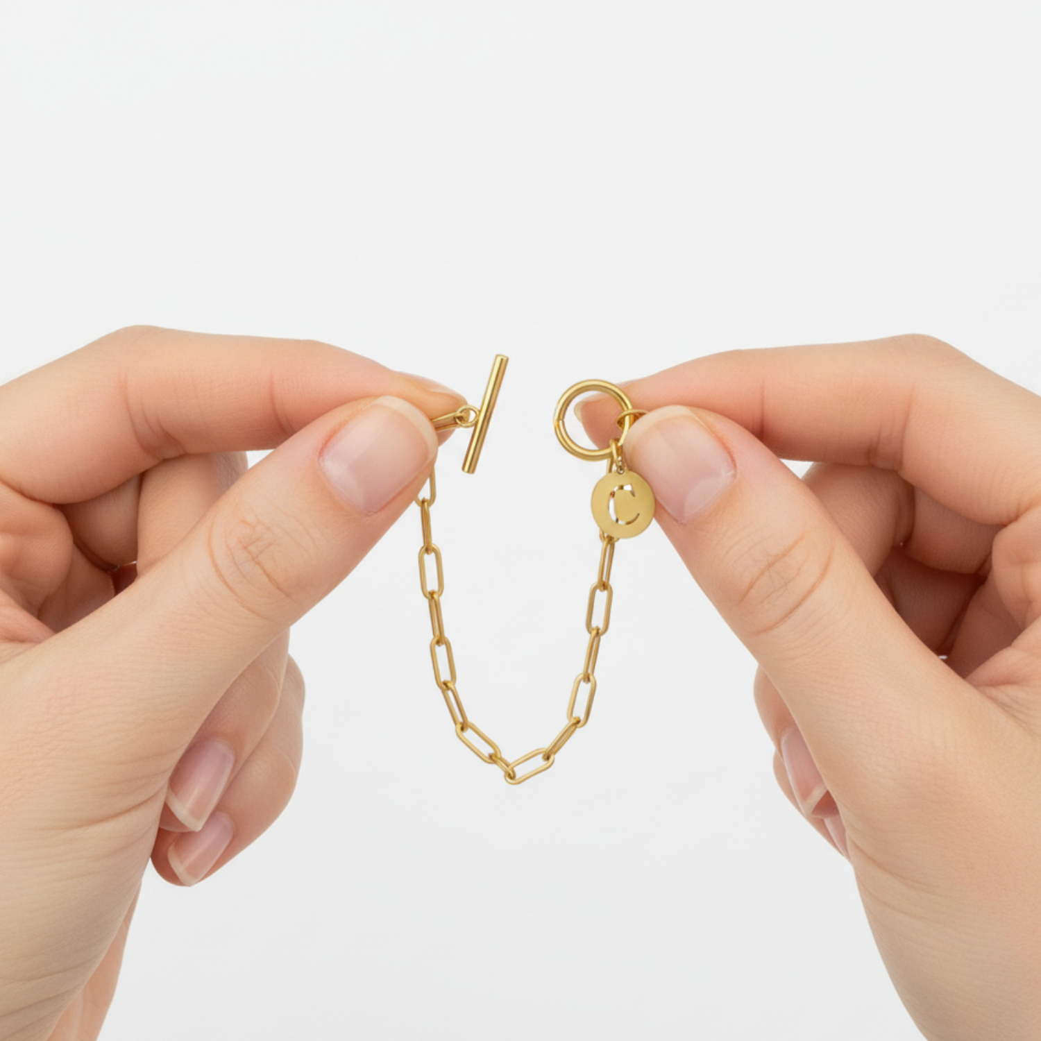 Zeigen Sie stolz Ihren Initialen (oder den eines geliebten Menschen) mit diesem Panzerkettenarmband mit graviertem Medaillon. Der raffinierte Knebelverschluss verleiht ihm einen trendigen und schicken Touch – perfekt für jeden Anlass.