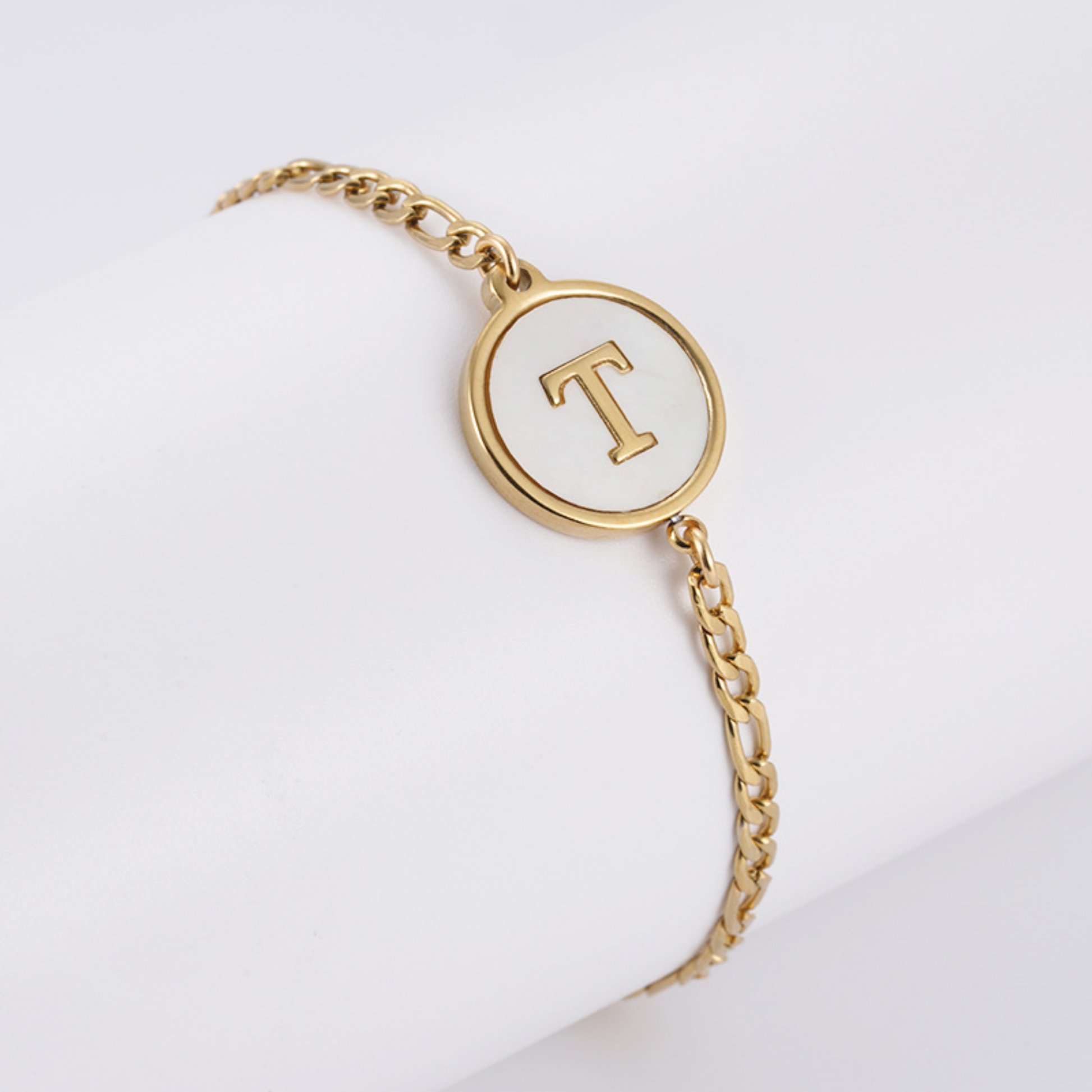 Verschenken (oder gönnen Sie sich) ein einzigartiges Schmuckstück von zeitloser Eleganz mit diesem personalisierten Vintage-Medaillon-Armband. Der runde Anhänger, erhältlich in Perlweiß oder Tiefschwarz, ist mit einem goldenen Initial im schicken Retro-Stil graviert und wird durch eine zarte goldene Panzerkette ergänzt. Dieses zarte Schmuckstück vereint auf wunderbare Weise Modernität und den Charme der alten Welt und schmückt jedes Handgelenk mit Charakter und Raffinesse.