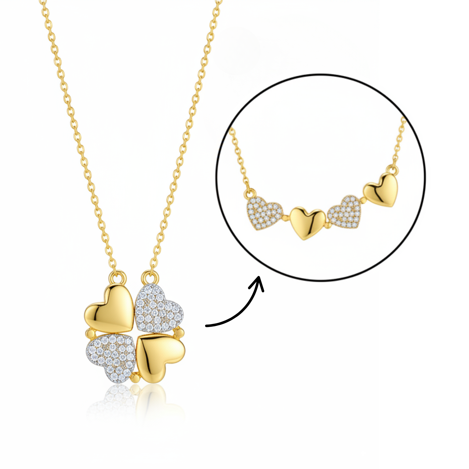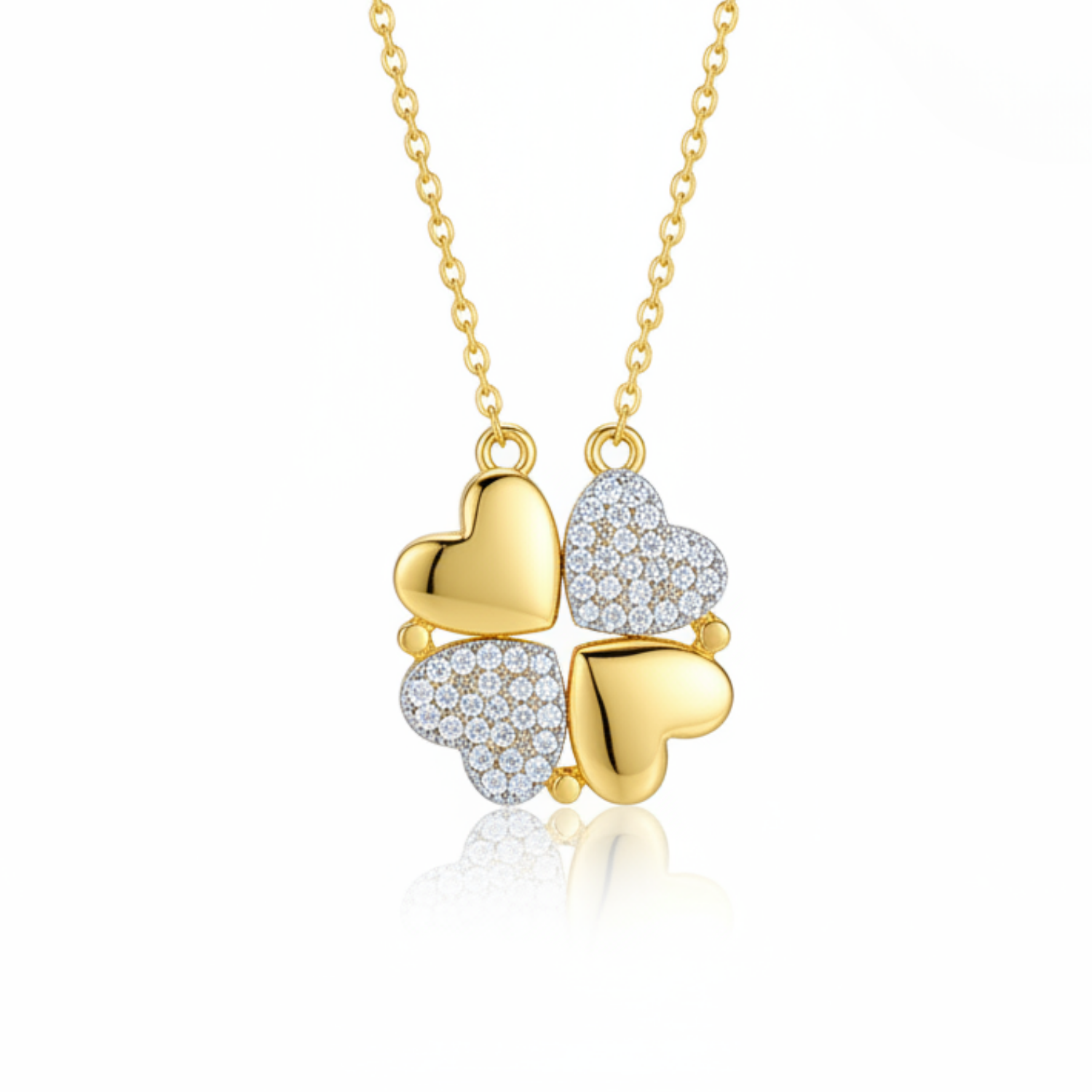 Diese Halskette besteht aus vier goldenen Herzen, zwei schimmernden Kristallen und zwei sanft polierten, die zusammen ein zartes vierblättriges Kleeblatt bilden. Ein raffiniertes Design, das Romantik und Glück vereint und seine Trägerin mit Anmut und Bedeutung begleitet.