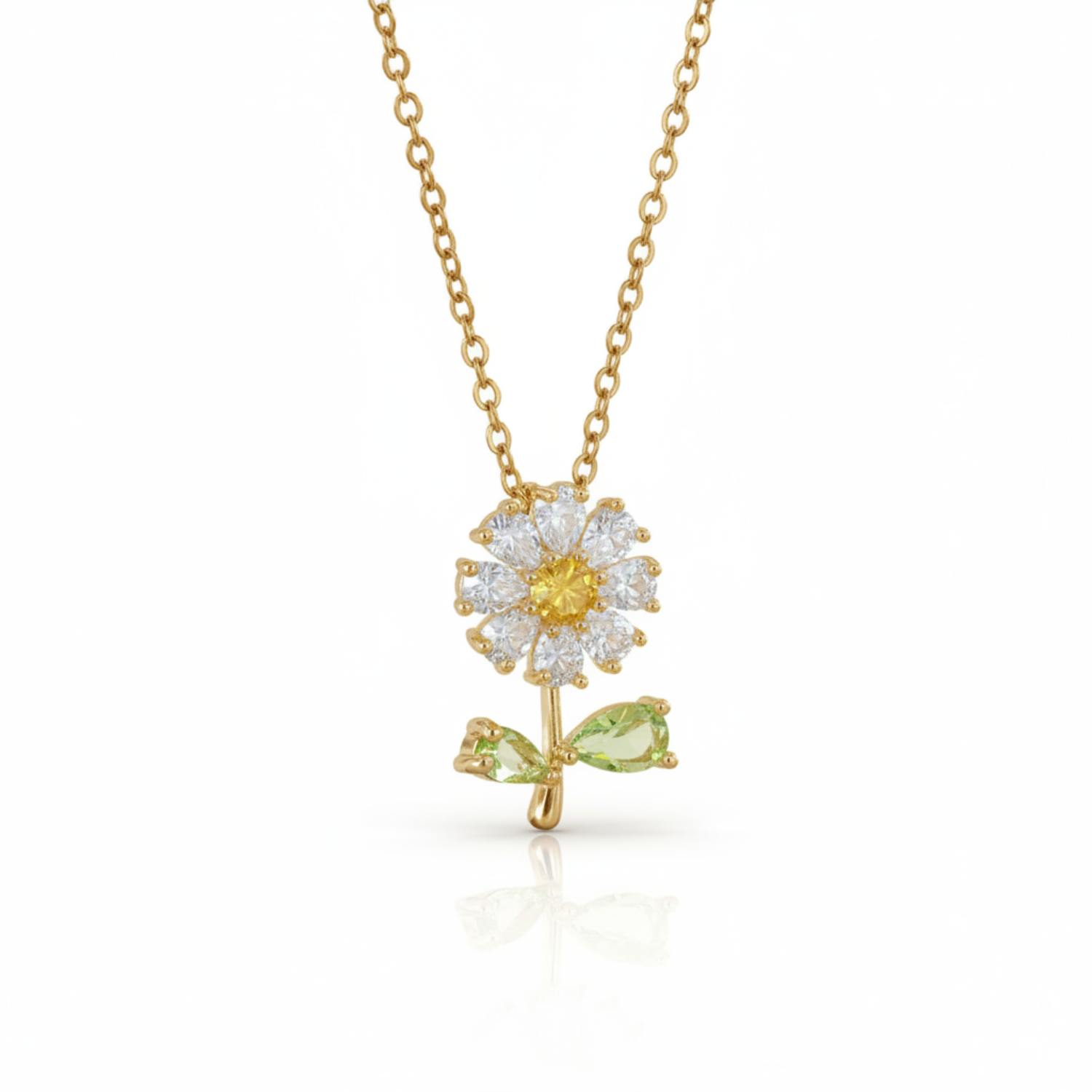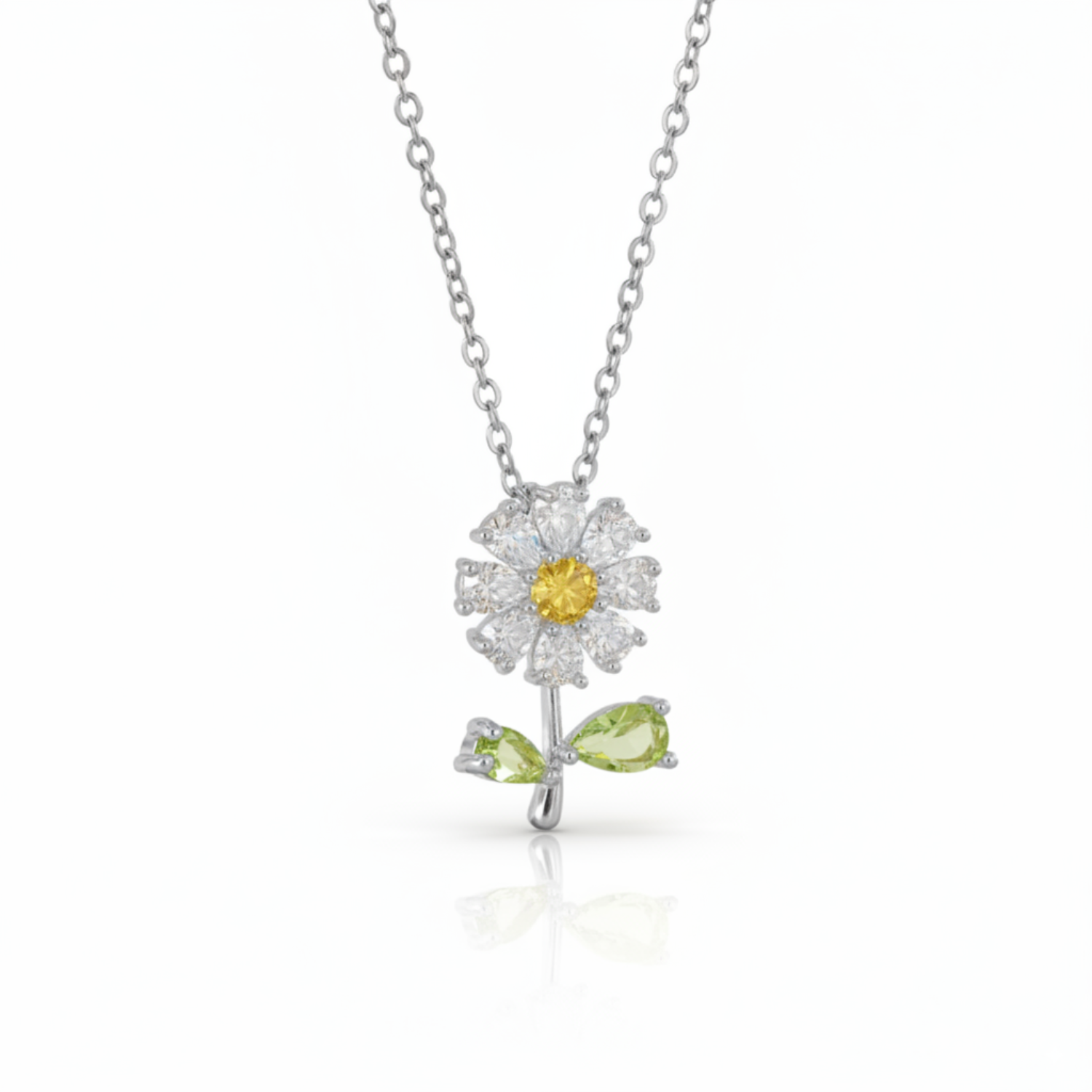 Zart, strahlend und unendlich elegant – die Halskette Pure Bloom fängt die zeitlose Schönheit einer Blume in voller Blüte ein. Der fein gearbeitete Anhänger zeigt eine Gänseblume mit perlmuttfarbenen Blütenblättern, begleitet von kristallklaren Blättern mit sanften grünen Reflexen.